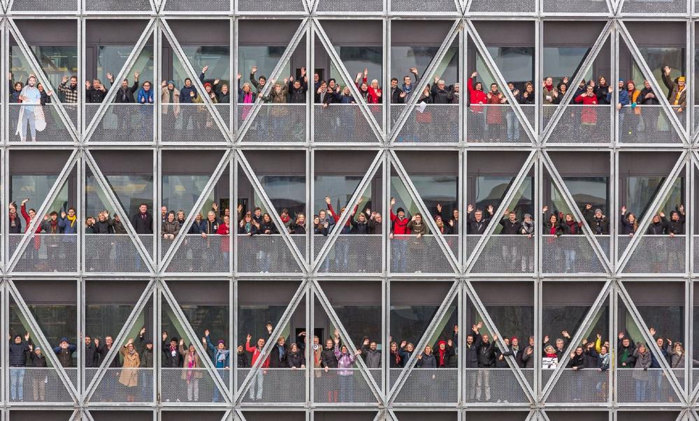 Die Netzstruktur aus Beton findet ihr Pendant, quasi als Verdopplung in einer filigranen, netzartigen Fassadenkonstruktion aus Stahlprofilen, die von den taz-Mitarbeitern „Häkeldecke“ genannt wird. Die selbsttragende Fassade legt sich um das Haus, erweitert es in den Stadtraum hinein und schafft einen umlaufenden Balkon. Sie verleiht dem Gebäude Leichtigkeit und ermöglicht es den Nutzern hinauszutreten und punktuell ihren Arbeitsplatz in den Außenraum zu erweitern. Eine vertikale Treppenkonstruktion verbindet die Geschosse miteinander. Aufgrund ihrer Dimension und Plastizität dient sie nicht nur der Erschließung, sondern ist auch die vertikale Fußgängerzone des Hauses. Die Zwischenpodeste fungieren als Orte der Begegnung und fördern die spontane Kommunikation.