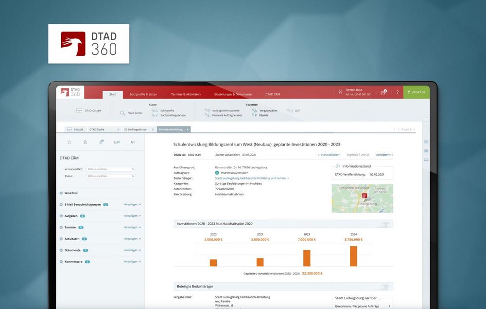 Die Vertriebsplattform DTAD 360 wird um das Modul „Investitionsvorhaben“ erweitert und bietet den mehr als 13.500 Nutzern die Möglichkeit, als Erste relevante Informationen zu Bedarfsentwicklungen und geplanten Investitionen einzusehen. Der deutsche SaaS-Anbieter DTAD baut seine Online-Plattform damit weiter zur ganzheitlichen Akquiselösung aus. Mit Launch des Moduls „Investitionsvorhaben“ erweitert das Unternehmen […]