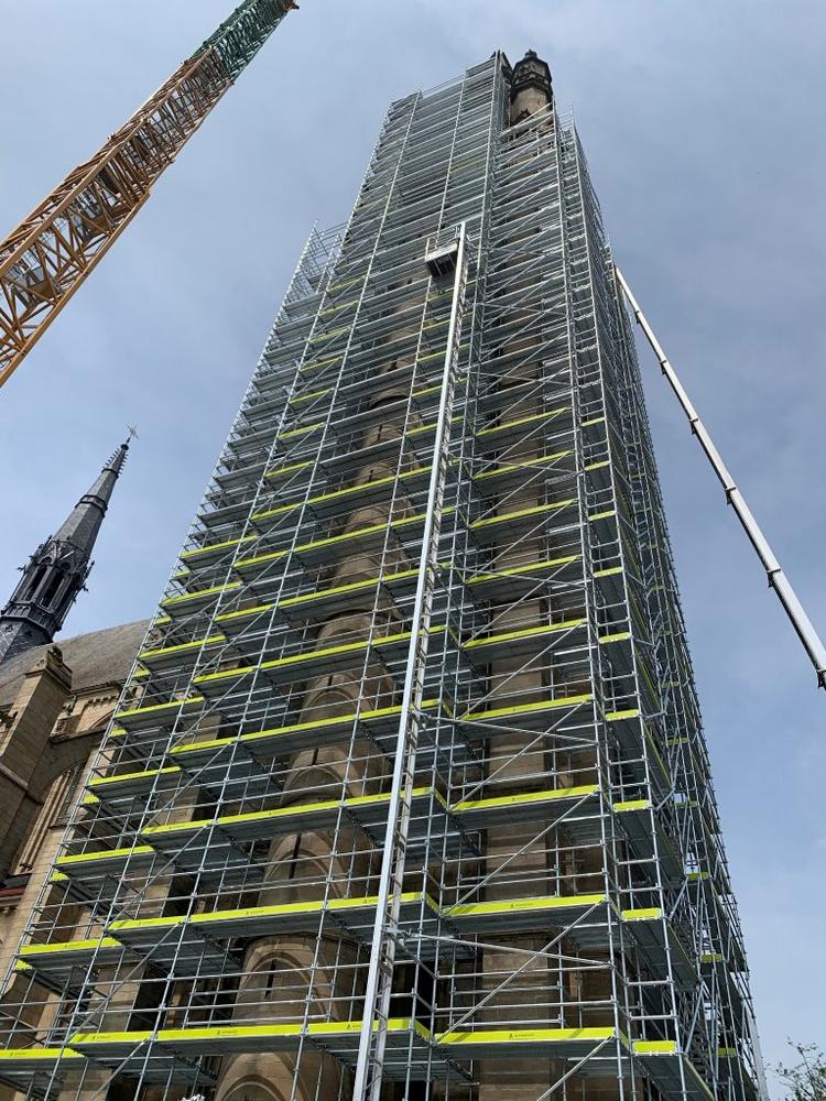 Nach dem erfolgreichen Einsatz im ersten Bauabschnitt ist der GEDA 200 Z Comfort nun erneut Teil der Sanierungsarbeiten an der denkmalgeschützten St.-Martín-Kirche in Arlon, Belgien. Die Firma Alphascaff setzt gleich zum zweiten Mal den kompakten Gerüstbauaufzugs ein, um den Aufbau des Gerüsts an weiteren Turmabschnitten effizient zu unterstützen.