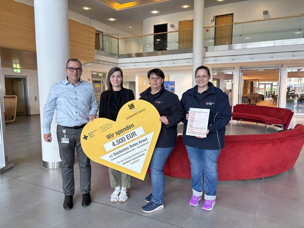 Mit einer Spende in Höhe von 4.500 Euro fördert LEONHARD WEISS gezielt die Ausbildung und das Engagement der Schülerinnen und Schüler im Schulsanitätsdienst der Leonhard-Sachs-Schule in Crailsheim. Die offizielle Scheckübergabe an das Deutsche Rote Kreuz (DRK) Kreisverband Schwäbisch Hall – Crailsheim e.V. und die Schule fand am 11. November in Satteldorf statt. Neben dem symbolischen Scheck in Herzform wurde auch eine Urkunde für die Patenschaft des Schulsanitätsdienstes überreicht.
