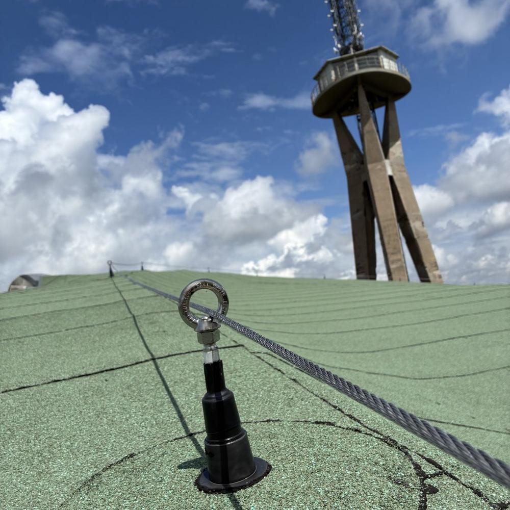 Eine der größten Herausforderungen stellte die geringe Tragfähigkeit der filigranen Dachschale dar: Punktlasten durften 0,75 kN nicht überschreiten, zudem war eine Zwischenlagerung von Material ausgeschlossen. Gemeinsam mit Planern und Denkmalbehörden entwickelte LUX-top deshalb eine individuelle Befestigungsmöglichkeit über den umlaufenden Ringanker des Daches. Das Resultat ist eine technisch ausgefeilte Lösung: Die 185 Meter lange Edelstahlseilanlage LUX-top FSE 2003, verankert an 33 Anschlagpunkten des Typs ASP EV2 zur Befestigung auf Beton, fügt sich harmonisch in die Architektur des Bauwerks ein. Um die Edelstahlseilanlage optimal an die geschwungene Dachform anzupassen, wurden die Abstände zwischen den Anschlagpunkten enger als üblich gesetzt.