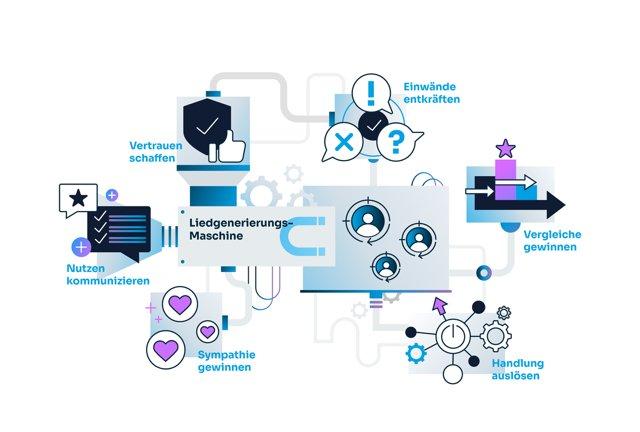 Es geht darum, Menschen im digitalen Raum anzusprechen, zu überzeugen und Handlungen auszulösen. Das Buch ist ein praktischer Leitfaden. Es beginnt damit, sich klar zu machen, wen man ansprechen will und wie. Also ganz klassisch: Zielgruppen. Wie ticken die? Welche Probleme haben die? Für welche Lösungen sind die empfänglich? Wie und wo wollen die überhaupt angesprochen werden? Das ist die Grundlage erfolgreichen Online-Marketings – ob ohne oder mit KI. Das ist der eine Teil. Der andere ist, wie das Überzeugen von der ersten Ansprache bis zur Handlung funktioniert. Das sind sechs Ebenen, die man im Prinzip abarbeiten muss. Es beginnt damit, Sympathie zu gewinnen, damit mein Gegenüber meine Kontaktaufnahme überhaupt annimmt. Dann erst kann ich den Nutzen meines Angebots kommunizieren. Die nächsten Ebenen sind, Vertrauen zu schaffen und Einwände, die ja meist eine Grundlage haben, zu entkräften. Als Nächstes kann die Entscheidungsfindung durch Vergleiche auf eine breitere Basis gestellt und so unterstützt werden. Erst dann kann man den letzten Schritt angehen, also versuchen, die gewünschte Handlung auszulösen.