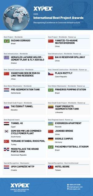 Im Rahmen des diesjährigen Programms gingen mehr als 80 Projekteinreichungen aus über 20 Ländern auf fünf Kontinenten ein, was die globale Reichweite der Xypex-Technologie und die Stärke des internationalen Netzwerks aus Vertriebshändlern, Ingenieuren, Bauunternehmern und Partnern widerspiegelt.