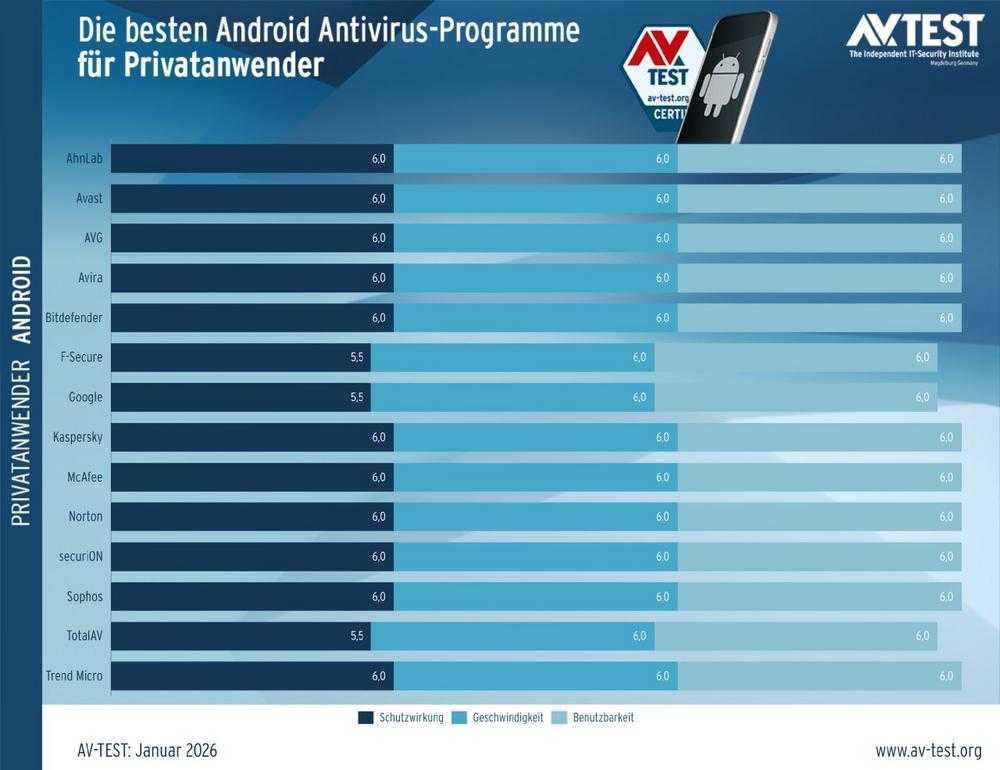 Liebe Medienpartner, liebe Freunde des AV-TEST Instituts, 14 Sicherheitslösungen für Android hat das AV-TEST Institut im Januar 2026 geprüft. Alle Apps und Services wurden in realistischen Tests in den Bereichen Schutzwirkung (Protection), Geschwindigkeit (Performance), Benutzbarkeit (Usability) und weiteren Funktionen (Features) untersucht. Die beigefügten Daten und Grafiken können ab sofort (d.h. ohne Embargo) für Übersichten, Statistiken und als Grundlage für […]